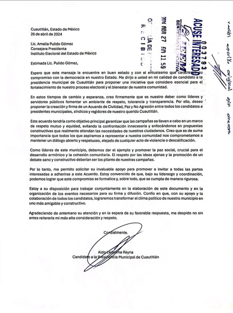 Corazón por el Estado de México”, Aldo Ledezma Reyna, convocó sus contrincantes a firmar un “Pacto por la Paz”.