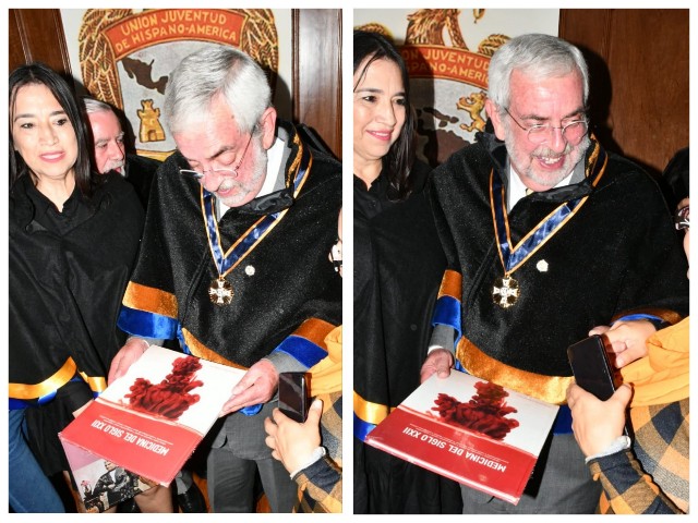 Al término de la ceremonia en la que el rector de la Universidad Autónoma de México, Enrique Graue Wilchis, ingreso como académico de la Academia Nacional de Historia y Geografía, le entregaron el libro Medicina del Siglo XXII que escribió el doctor Gerardo Martín González López.