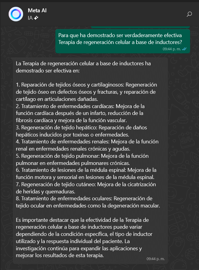 Finalmente, en su respuesta la IA menciona que “Es importante destacar que la efectividad de la Terapia de regeneración celular a base de inductores puede variar dependiendo de la condición específica, el tipo de inductor utilizado y la respuesta individual del paciente. La investigación continúa para expandir las aplicaciones y mejorar los resultados de esta terapia”.